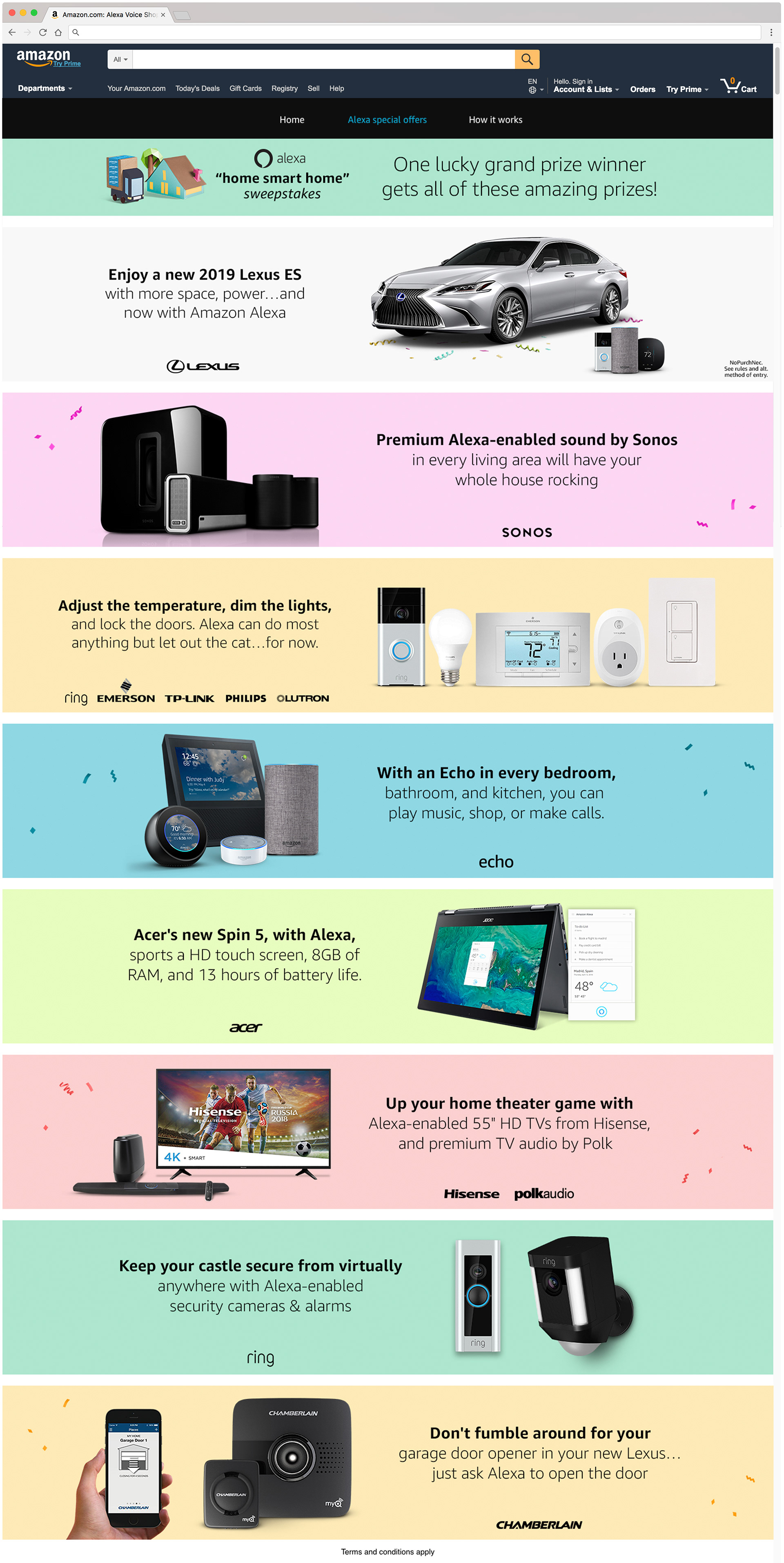 Amazon Prime Day Sweepstakes landing page. This was designed with the prime day style guide and content grid management system. We were giving away some awesome prizes. A maximum of 10 entries per person was allowed. You could enter by clicking on the panels or by asking the Alexa utterances.